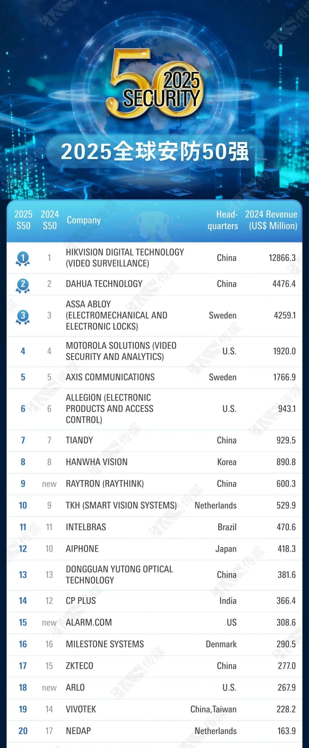 天地偉業(yè)蟬聯(lián)全球安防50強(qiáng)第七名